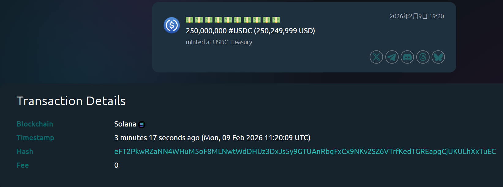 TechFlowからの報道によると、2月9日、Whale Alert(@whale_alert)の監視データによれば、USDC TreasuryがSolanaチェーン上で新たに2億5,000万枚のUSDCを発行しました。