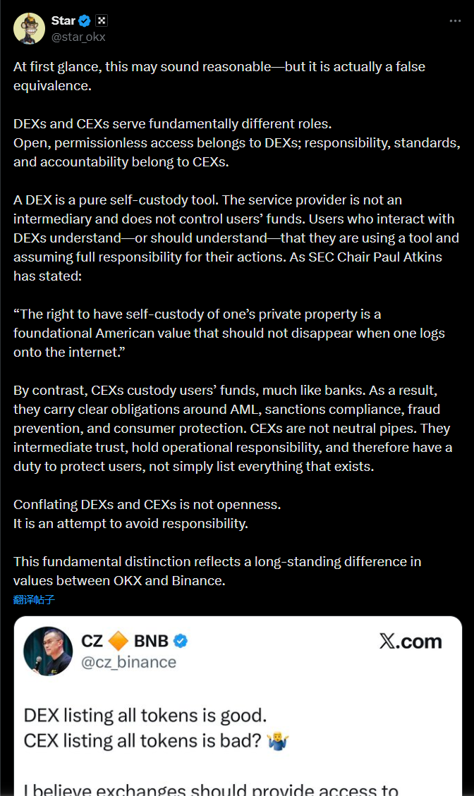 TechFlowの報道によると、2月10日、OKXの最高経営責任者(CEO)であるスター氏がソーシャルメディアで投稿し、分散型取引所(DEX)と中央集権型取引所(CEX)は本質的に異なる役割を担っていると指摘しました。オープンで許諾不要なアクセスはDEXに属し、一方で責任・基準・説明責任はCEXに属します。DEXは純粋なセルフカストディ(自己管理)ツールであり、サービス提供者は仲介者ではなく、ユーザー資金を一切制御しません。これに対し、CEXはユーザー資金を預託管理するため、銀行に近い性質を持ち、マネーロンダリング防止(AML)、制裁遵守、詐欺防止および消費者保護に関して明確な義務を負います。CEXは運用責任を負うため、単に存在するすべてのトークンを上場するだけでなく、ユーザーを保護する義務があります。スター氏は、「DEXとCEXを混同することは『オープン』ではありません。これは責任回避を試みる行為であり、OKXとバイナンス(Binance)の間で長年にわたって存在する価値観の相違を反映しています」と述べました。