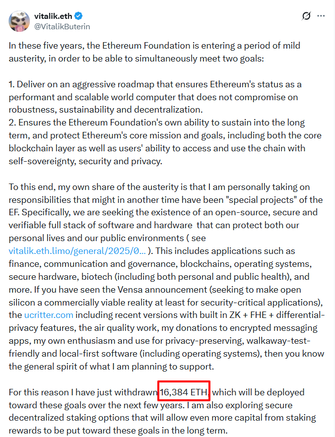 先日の投稿で、ブテリン氏は「個人的に16,384 ETHを引き出し、オープンソースのフルスタックな検証可能なソフトウェアおよびハードウェアの発展を支援する」と述べていた。