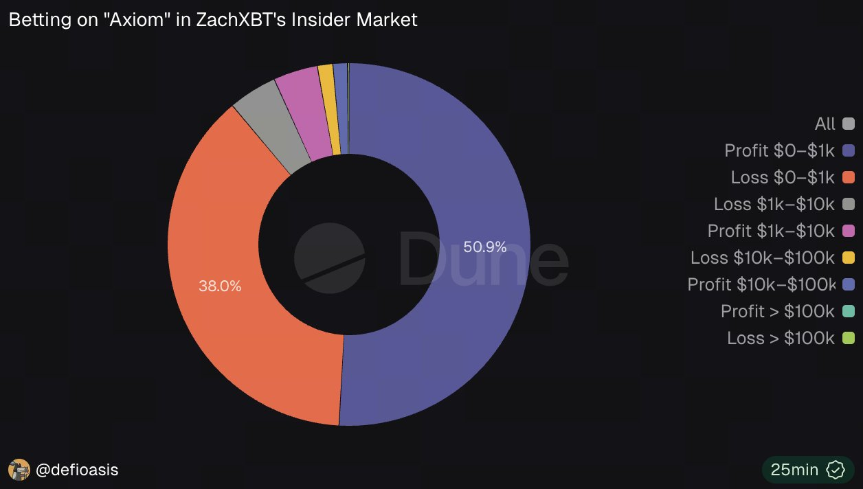 TechFlowの報道によると、2月27日、暗号資産アナリストのdefioasis.eth(@defioasis)が監視したところ、Polymarket上で「ZachXBTの内密調査事件」に関するベットにおいて、3,630件を超えるPolymarketアドレスが「Axiom」にベットし、そのうち56.2%のアドレスが利益を上げた。