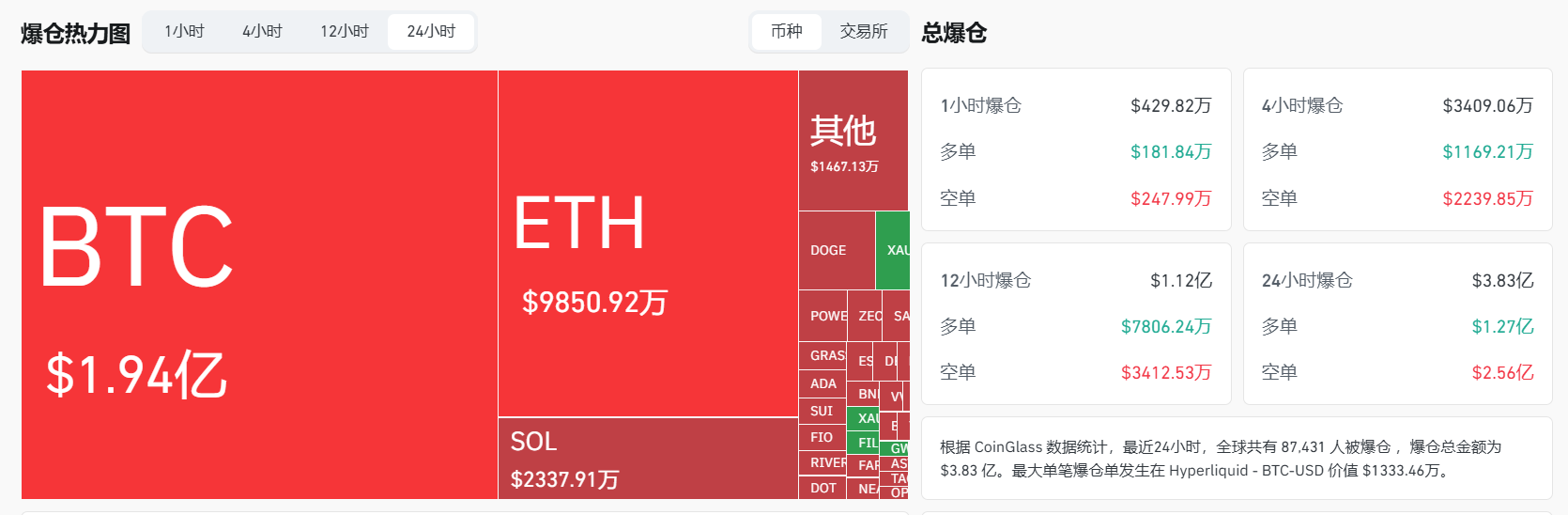 ビットコイン(BTC)の清算額は1億9,400万米ドル、イーサリアム(ETH)は9,850万9,200米ドルであった。また、過去24時間では合計87,431人が清算され、最大単体清算はHyperliquidにおけるBTC/USD取引ペアで発生し、金額は1,333万4,600米ドルであった。