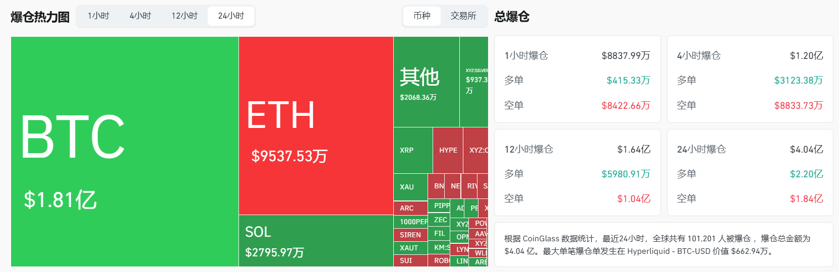 ビットコイン(BTC)の清算額は1億8100万米ドル、イーサリアム(ETH)の清算額は9537万5300米ドルであった。また、過去24時間で清算された取引者は10万1201人であり、最大単体清算はHyperliquidのBTC/USD取引ペアで発生し、金額は662万9400米ドルであった。
