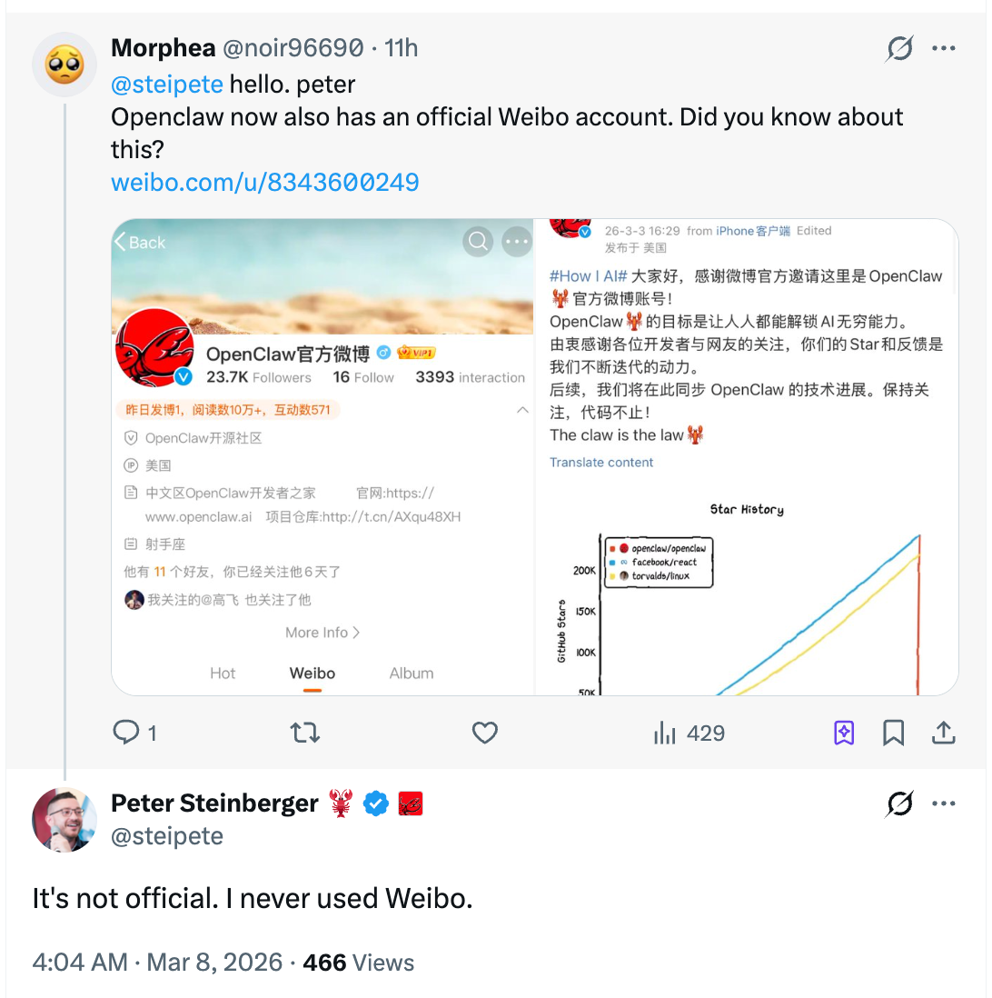 TechFlowからの報道によると、3月8日、OpenClawの創設者であるピーター・シュタインベルガー氏が、本日X(旧Twitter)上で「OpenClawが公式新浪微博アカウントを開設したことをご存知か?」というユーザーの質問に対し、「私はこれまで一度も新浪微博を利用したことがなく、そのいわゆる『公式新浪微博アカウント』は私が管理・運営しているものではありません」と返答しました。