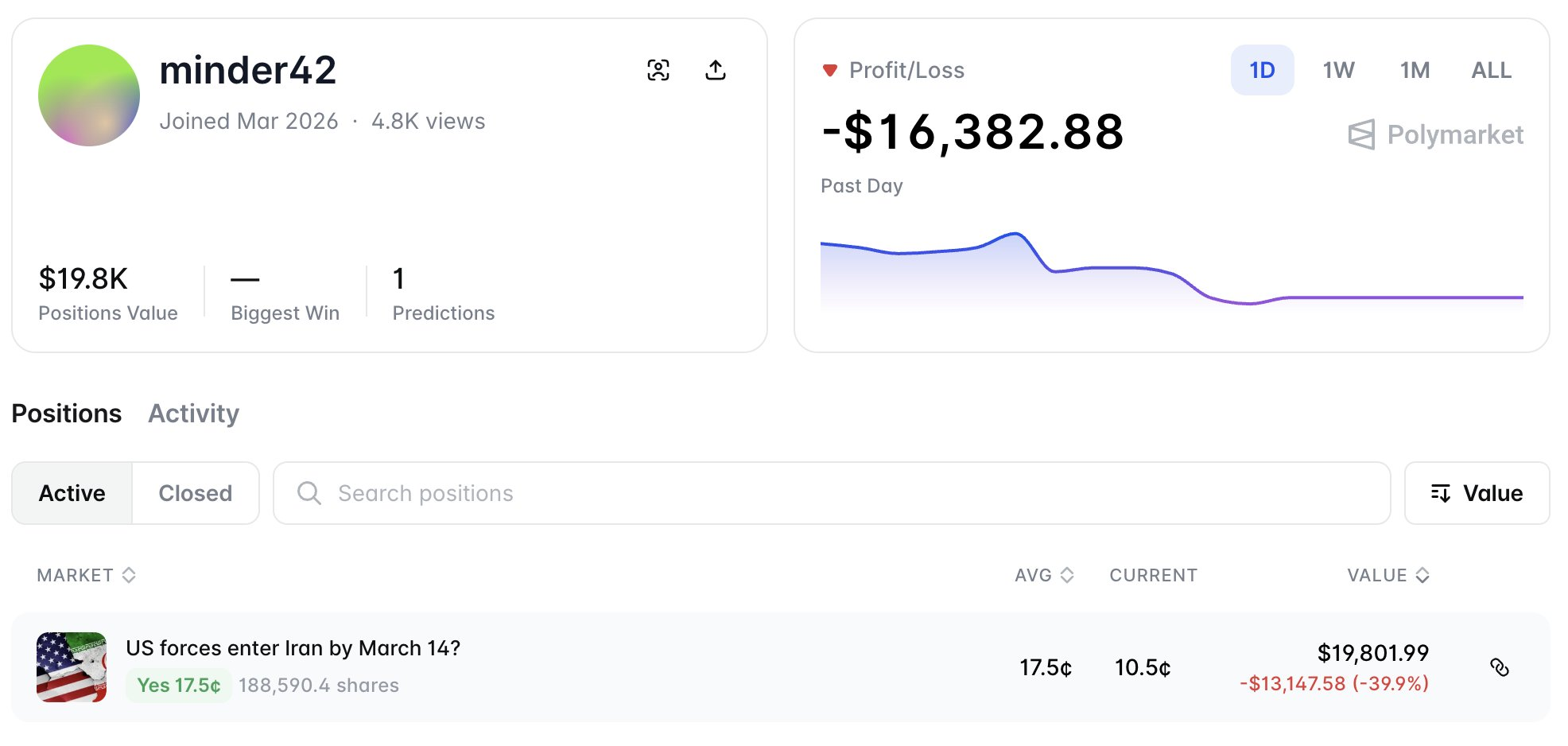 Lookonchainの監視によると、あるユーザーが20時間前に新規ウォレット「minder42」を作成し、米軍が3月14日までにイランに侵攻すると予想してベットしました。オッズは継続的に低下しているにもかかわらず、このユーザーはベット額を増やし続けています。現在までに、このユーザーの累計投資額は3万2,900米ドルに達しています。
