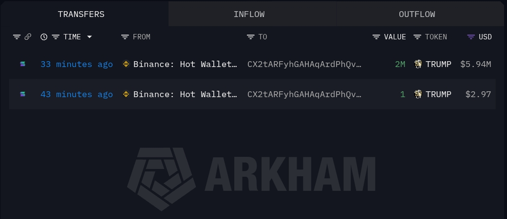 Onchain Lens(@OnchainLens)の監視によると、新規ウォレットがバイナンス(Binance)から200万枚の$TRUMPトークンを引き出しました。その価値は約594万米ドルです。