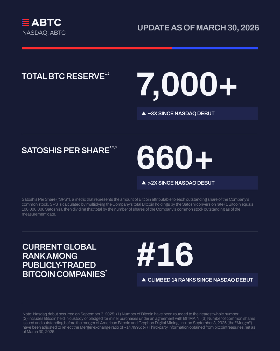 TechFlowの報道によると、3月30日、トランプ家が支援するビットコイン(BTC)マイニング企業American Bitcoin(ナスダック上場コード:ABTC)は、自社のBTC保有状況に関するデータを公開し、現在の保有量が7,000枚を突破したと発表しました。同社は、ナスダック上場以降、BTC保有量が約3倍に増加したと述べています。世界の上場企業におけるBTC保有規模ランキングでは、American Bitcoinは現在16位に位置しています。