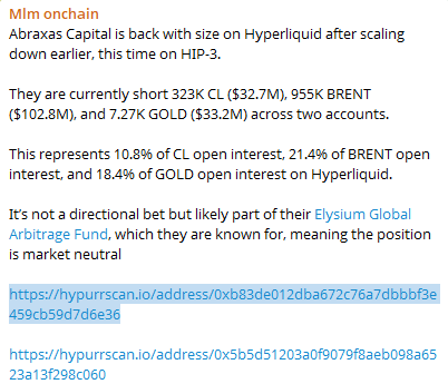 また、Abraxas Capitalはこれまでに、WTI原油約3,270万米ドル分、ブレント原油約1億280万米ドル分、および金約3,320万米ドル分の空売りポジションをすでに保有しています。これらのポジションは、それぞれHyperliquidプラットフォームにおける当該市場の未決済建玉総額の約10.8%、21.4%、18.4%を占めており、その規模は非常に大きいものです。