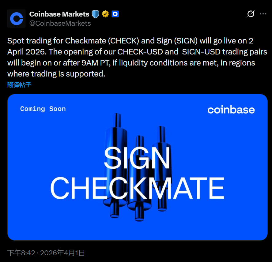 Coinbase取引所は、2026年4月2日にCHECK(Checkmate)およびSIGN(Sign)の現物取引を正式に開始することを発表しました。 具体的には、CHECK-USDおよびSIGN-USDの2つの取引ペアが、太平洋時間午前9時以降に開始される予定です。ただし、実際の取引開始時刻は流動性条件の満たし具合によって左右され、また関連取引サービスを提供している地域に限定して利用可能です。