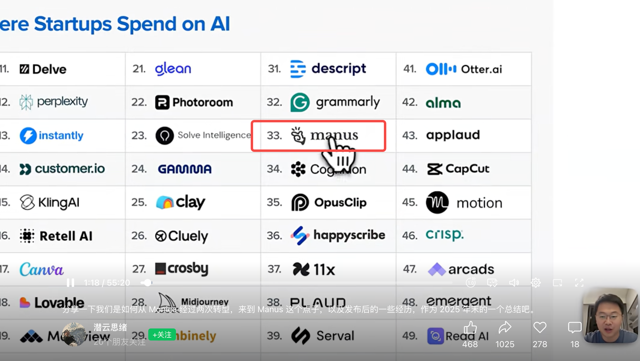 除了主榜单外,A16Z 还发布了一个基于用户消费量的榜单,统计北美地区创业公司使用 AI 工具的情况。这个榜单显示,Manus 在消费量排名中位列第 33 位。这从侧面证明了 Manus 在用户覆盖率和营收方面的全球表现,取得了显著的成绩。