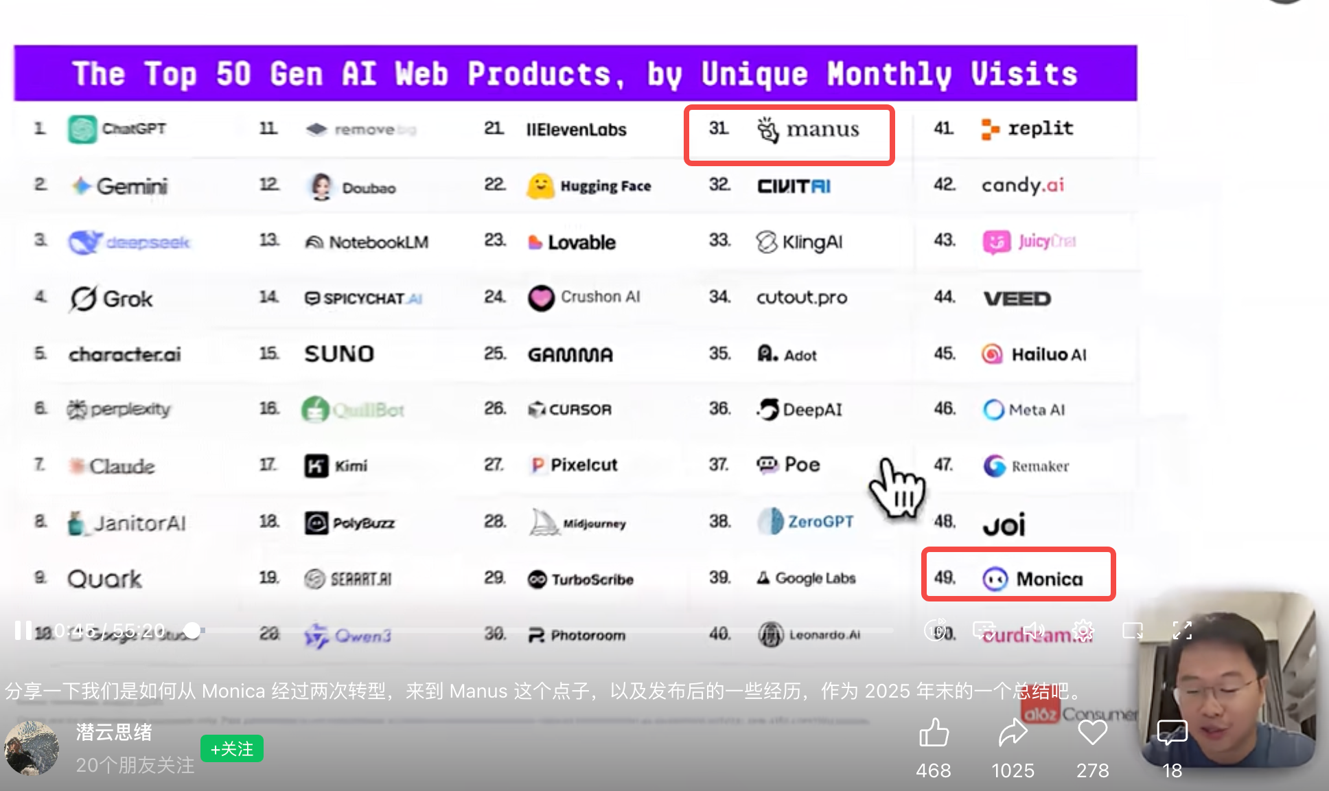Monica 的核心价值在于其浏览器插件场景,能够帮助用户在当前上下文中直接高效地利用 AI,而无需跳转到其他地方,这个产品本身取得了不错的成功。在 Chrome 的 Web Store 上,Monica 已经有约 300 万用户,获得了3万条评分,平均评分高达4.9分,成绩非常亮眼。在商业上,Monica也取得了一定的成功。虽然我们现在的主要精力放在 Manus 上,但 Monica 仍然由一个小团队负责开发和维护,并且即将迎来一次重要的更新。目前,Monica 仍为公司贡献了约1500万美元的年度经常性收入 (ARR)。