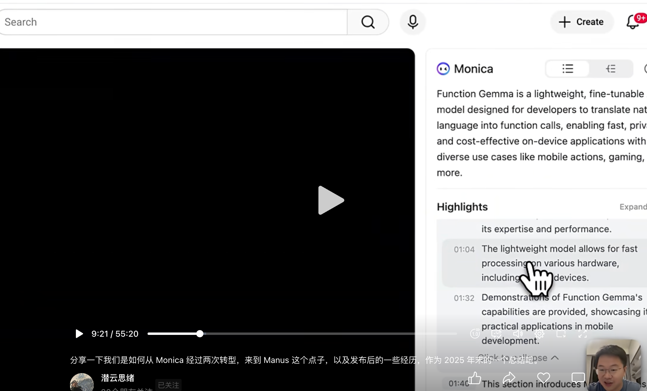 Monica 还支持许多其他功能。例如,当用户在观看 YouTube 视频时,插件可以在视频的右侧生成一个内容摘要,提供视频的主要信息和具体时间线。用户可以点击时间线,快速跳转到相关内容。这种功能让用户能够高效地浏览视频内容。