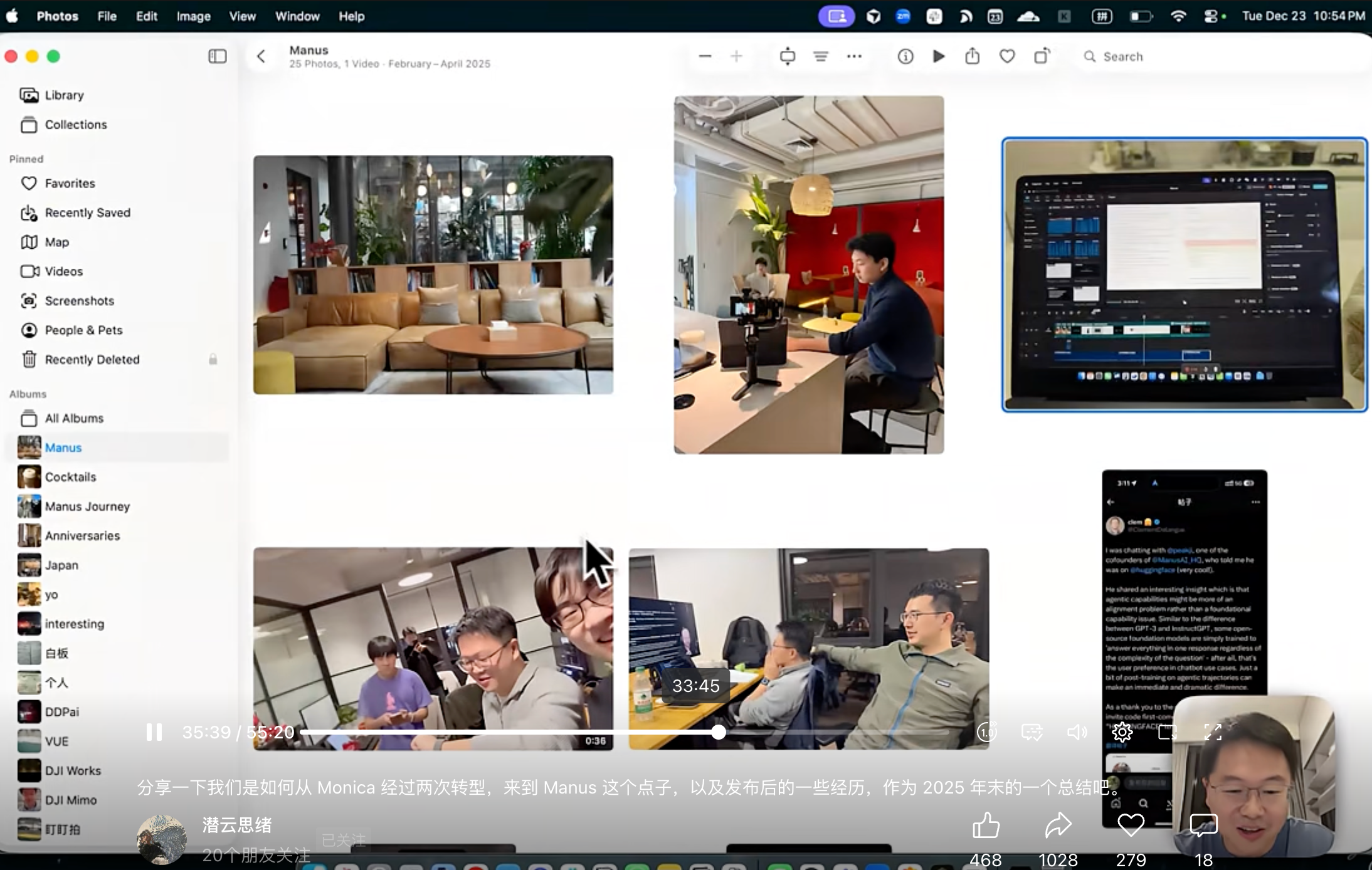 Manus 发布会的视频是我们团队自己拍摄的,过程充满了创业的艰辛和创意。3 月 1 日正式拍摄时,我使用了自己的索尼相机,并向投资人借了一款非常优秀的镜头。我的实习生也参与了拍摄。整个视频的制作费用非常低廉:我花了 9.9 美元购买了背景音乐 (BGM) 的版权,又花了 19.48 美元买了 CapCut 的会员,用来剪辑视频。视频最终成为我个人视频号播放量最高的一段内容,传播非常广。
