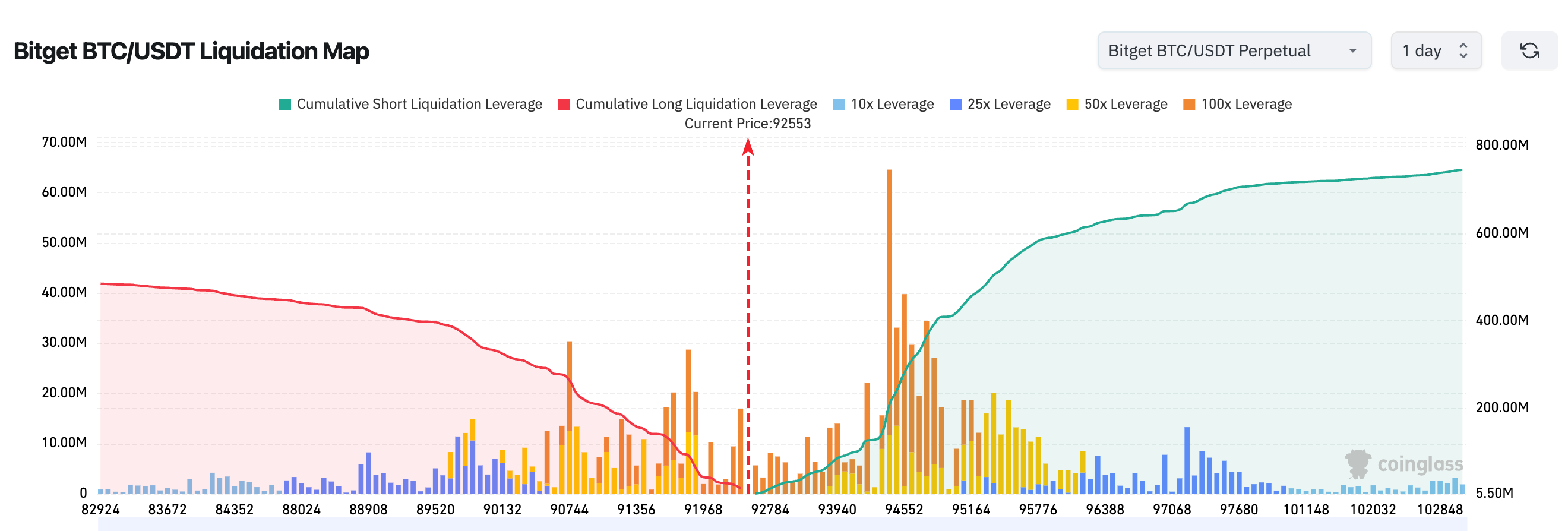 3. Bitget BTC/USDT 청산 지도에 따르면: Bitget BTC/USDT 청산 지도에 따르면, 현재 가격 약 92,500달러 부근이 롱/숏의 주요 분기점이며, 그 아래 91,000–92,000달러 구간에서 롱 포지션 청산이 점진적으로 누적되고 있어, 만약 이 구간을 하회할 경우 추가적인 연쇄 손절매를 유발할 수 있습니다. 위쪽 94,500–96,000달러 구간에는 숏 포지션 청산이 밀집되어 있어, 일단 가격이 효과적으로 돌파하면 뚜렷한 숏 스퀴즈가 발생하여 BTC의 가속 상승 행세를 촉진할 수 있습니다.