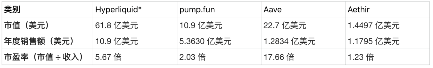 Hyperliquid, Pump.fun 등 주요 수익 프로젝트들의 주가수익비(PER)를 통해 그 가치를 판단할 수 있다. 주가수익비는 '시가총액 ÷ 연간 수입'으로 계산되며, 이 지표는 프로젝트의 평가가 실제 수입 대비 얼마나 합리적인지를 반영한다.