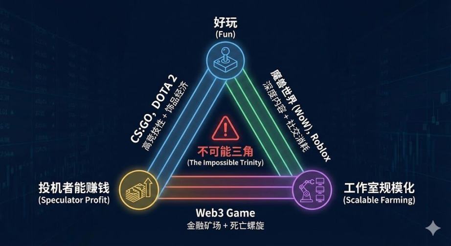 이는 마치 게임의 ‘불가능한 삼각형’과 같습니다. ‘재미있음’, ‘투기자가 이익을 얻음’, ‘스튜디오가 산업화 가능함’ 사이에서, 당신은 최대 두 가지만 동시에 실현할 수 있습니다.