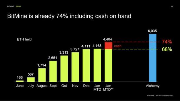 BitMine 의장 톰 리(Tom Lee, @funstrat)가 말한 ‘5% 연금술’ — 즉 이더리움 전체 공급량의 5%를 확보하겠다는 포부다. 2026년 1월 11일 기준 BitMine은 4,167,768개의 ETH를 보유하고 있으며, 이는 전체 이더리움 공급량(유통량 약 1.207억 개)의 약 3.45%에 해당한다. 단 6개월 만에 목표의 거의 70%를 달성한 것이다. 이 방대한 보유량 덕분에 BMNR은 세계에서 압도적으로 선두를 달리는 공개 이더리움 보유 기업이 되었다. 구체적으로 말하자면, BitMine이 보유한 ETH는 대부분의 주요 DeFi 프로토콜보다 많으며, 이더리움 재단(Ethereum Foundation) 같은 최상위 보유자들을 넘어서고, 다른 암호화폐를 보유한 상장기업들도 크게 앞서 있다. 다만 MicroStrategy의 비트코인 보유량(약 67.2만 BTC)보다는 크지만, 이더리움이라는 특정 분야에서는 BitMine이 유일무이한 ‘거대 고래(whale)’다. 완전한 5%(약 600만 개 이상의 ETH) 달성은 여전히 최종 목표이며, 경영진은 전혀 멈출 기미를 보이지 않고 있다. 최근 몇 주간 현금 보유액을 늘리는 동시에 수만 개 단위로 꾸준히 ETH를 추가 매입하고 있다. 이런 규모감은 버크셔가 코카콜라나 애플 주식에 집중 투자했던 모습을 떠올리게 한다. 다만 이번에는 디지털 자산으로 바뀐 것이다. BitMine이 매우 확신 있게 걸고 있는 베팅은 바로 ‘이더리움이 미래의 금융 네트워크가 될 것’이라는 전망이며, 그 거대한 지분을 확보하는 것은 막대한 전략적·경제적 이득을 가져다줄 것이라는 믿음이다.
