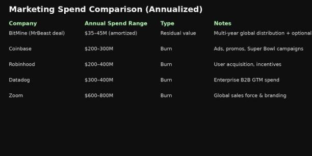 BitMine은 현재 연간 스테이킹 수익으로 약 3~3.5억 달러를 벌어들이고 있다. 올해 5% ETH 목표를 달성하면, 연간 수익은 약 5억 달러에 이를 전망이다. 회사는 약 10억 달러의 현금을 보유하고 있으며, 부채는 전혀 없고, 운영 비용은 거의 무시할 수 있다. 이런 상황에서 2억 달러를 수년에 걸친 마케팅 전략으로 투입하는 것은 전혀 무모하지 않다—오히려 보수적이며, 자본 효율성이 높고, 매우 현명한 결정이다.