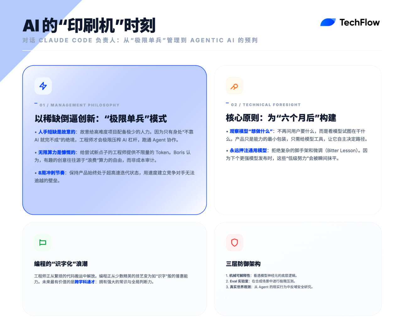 클로드 코드 팀은 현재 인재를 모집 중입니다. 개인적으로는, 이 모든 것이 제 작업을 더욱 즐겁게 만들었습니다. 저는 오늘날만큼 프로그래밍을 즐긴 적이 없습니다. 왜냐하면 저는 더 이상 사소한 세부 사항을 처리할 필요가 없기 때문입니다. 우리는 또한 많은 고객들로부터 유사한 피드백을 듣고 있습니다—그들은 클로드 코드를 사랑합니다. 왜냐하면 그것이 프로그래밍을 다시 즐겁게 만들기 때문입니다. 그러나 이 일이 어디로 향할지는 예측하기 어렵습니다. 저는 여전히 역사적 비유를 찾아야 하고, 인쇄기는 정말 적절한 비유입니다—원래 소수만이 가졌던 능력, 즉 읽고 쓰는 능력이 모두에게 열리게 된 것입니다. 이것은 본질적으로 민주화입니다. 모두가 이 일을 할 수 있게 되었고, 그렇지 않았다면 르네상스는 결코 일어나지 않았을 것입니다. 왜냐하면 르네상스는 크게 지식 전파와 문자 기록에 의존했기 때문입니다—그 당시에는 전화도 없었고, 인터넷도 없었고, 문자는 사람들이 대규모로 조정하는 유일한 방식이었습니다. 저는 몇 년 후에는 모두가 프로그래밍할 수 있고, 누구나 언제든지 소프트웨어를 구축할 수 있는 세상을 상상합니다. 그러면 무엇이 풀릴까요? 저는 전혀 상상할 수 없습니다. 마치 1400년대 사람들이 앞으로 무슨 일이 일어날지 상상하지 못했듯이 말입니다. 그러나 저는 전환기에는 이것이 매우 파괴적일 것이며, 많은 사람들에게 고통스러울 것이라고 확신합니다. 이것은 우리 사회가 함께 논의하고 대응해야 하는 일입니다.