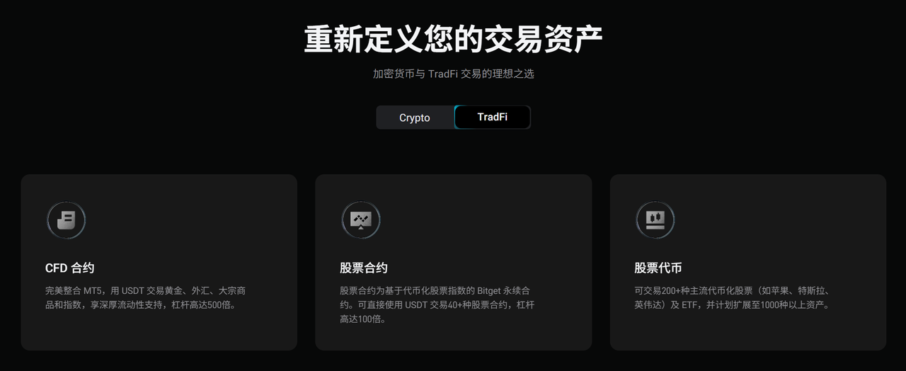 2026년 1월 5일, Bitget TradFi가 출시되며 ‘한 계정으로 전 세계 자산을 구매한다’는 목표를 향한 중요한 한 걸음을 내디뎠다: 온도 파이낸스(Ondo Finance), 엑스스톡스(xStocks)와의 심층 협력을 통해 Bitget은 이미 200종 이상의 주요 미국 주식 및 ETF를 상장하였으며, 2030년까지 1,000종 이상으로 확대할 계획이다. 주식 선물계약(CFD) 분야에서는 40종 이상의 주식 영구선물계약을 제공하며, 최대 100배 레버리지를 지원한다. 또한 TradFi CFD 모듈은 MT5를 통합하여 외환, 금, 원유, 지수 등 다양한 자산군을 커버하며, 최대 500배 레버리지를 제공한다.