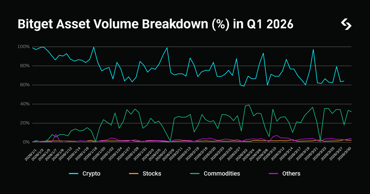 가장 직관적인 거래 데이터를 살펴보면, Bitget 보고서에 따르면 2026년 1분기 Bitget의 비암호화폐 자산 거래량 비중은 최고 40%를 넘었다.