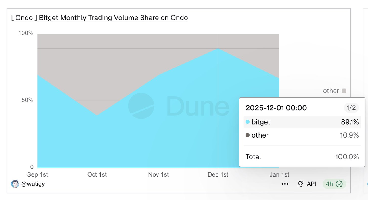 공식 자료에 따르면, Bitget CFD 부문의 일일 거래량은 이미 60억 달러를 돌파하였다. 토큰화 주식 사업의 시장 점유율은 더욱 주목할 만하다: 2025년 12월, Bitget의 토큰화 주식 월간 거래량은 온도 파이낸스(Ondo)의 전 세계 시장 점유율 중 89.1%를 차지한 바 있으며, 애플, 구글, 테슬라 등 미국 핵심 기술 기업 주식 계약의 보유 포지션 규모도 전 세계 CEX 중 1위를 기록한 바 있다.