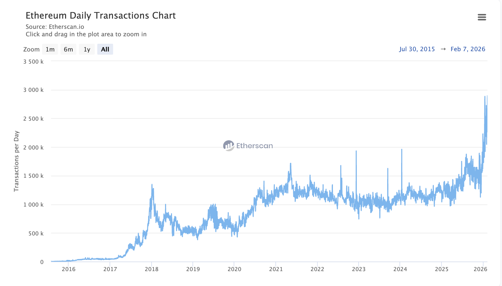 TechFlow 보도에 따르면, 2월 8일 이더스캔(Etherscan) 데이터에 따르면 이더리움 네트워크의 전날 거래 건수가 2,896,853건으로 증가해 사상 최고치를 기록했다.원문 링크즐겨찾기 추가소셜 미디어 공유