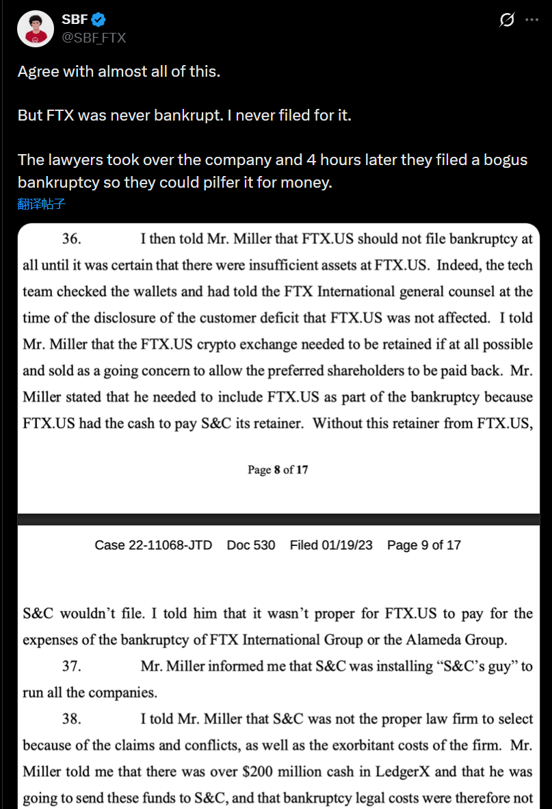 FTX 거래소 전 CEO 샘 뱅크먼-프리드(SBF)는 X 계정을 통해 “FTX는 결코 파산한 적이 없다. 나는 결코 파산 신청을 한 적이 없다. 변호사들이 회사를 인수한 지 4시간 후, 그들은 회사 자금을 탈취하기 위해 허위 파산 신청서를 제출했다.”라고 게시했다.