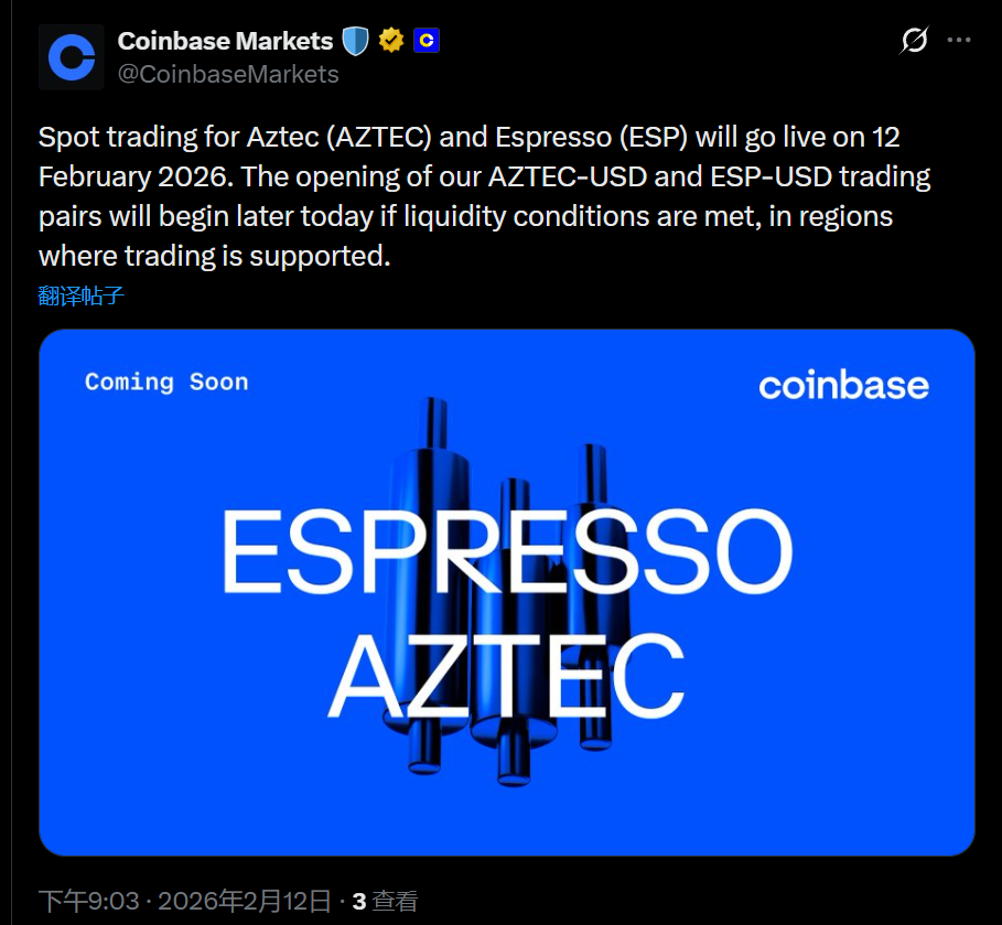 TechFlow 보도에 따르면, 2월 12일 코인베이스 마켓스(Coinbase Markets) 공식 발표에 따르면, 아즈텍(AZTEC)과 에스프레소(ESP)의 현물 거래가 2026년 2월 12일에 시작된다. 유동성 조건이 충족되는 경우, AZTEC-USD 및 ESP-USD 거래쌍은 오늘 늦은 시간에 거래를 지원하는 지역에서 개시될 예정이다.