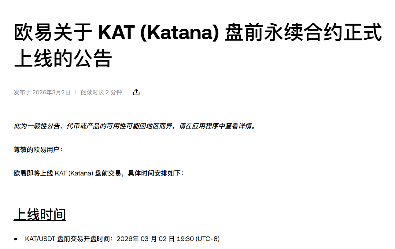 TechFlow 보도에 따르면, 3월 2일 공식 공지에 따라 OKX가 KAT(카타나) 프리마켓 영구선물계약을 상장합니다. 구체적인 일정은 다음과 같습니다:KAT/USDT 프리마켓 거래 개시 시간: 2026년 3월 2일 19시 30분(UTC+8)원문 링크즐겨찾기 추가소셜 미디어 공유
