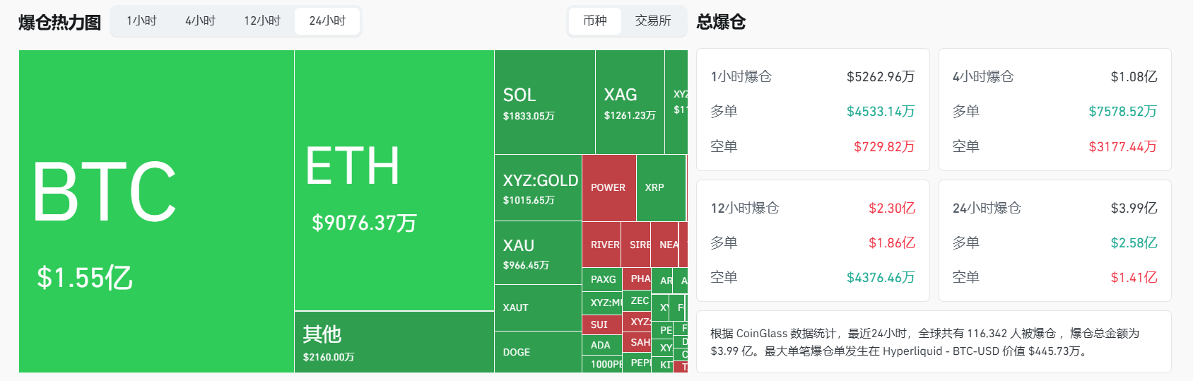 비트코인(BTC) 청산 금액은 1.55억 달러, 이더리움(ETH) 청산 금액은 9076.37만 달러였다. 지난 24시간 동안 총 116,342명이 청산되었으며, 최대 단일 청산 건은 하이퍼리퀴드(Hyperliquid)의 BTC-USD 거래쌍에서 발생해 445.73만 달러 규모였다.