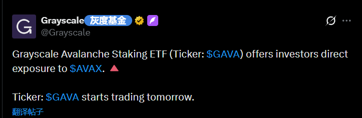 TechFlow 보도에 따르면, 3월 12일 공식 발표에 따르면 그레이스케일(Grayscale)이 아발란체(Avalanche) 스테이킹 ETF(종목 코드: $GAVA)를 출시한다고 밝혔다. 이 상품은 투자자에게 $AVAX에 대한 직접 노출을 제공한다. $GAVA는 내일부터 정식 거래를 시작한다.