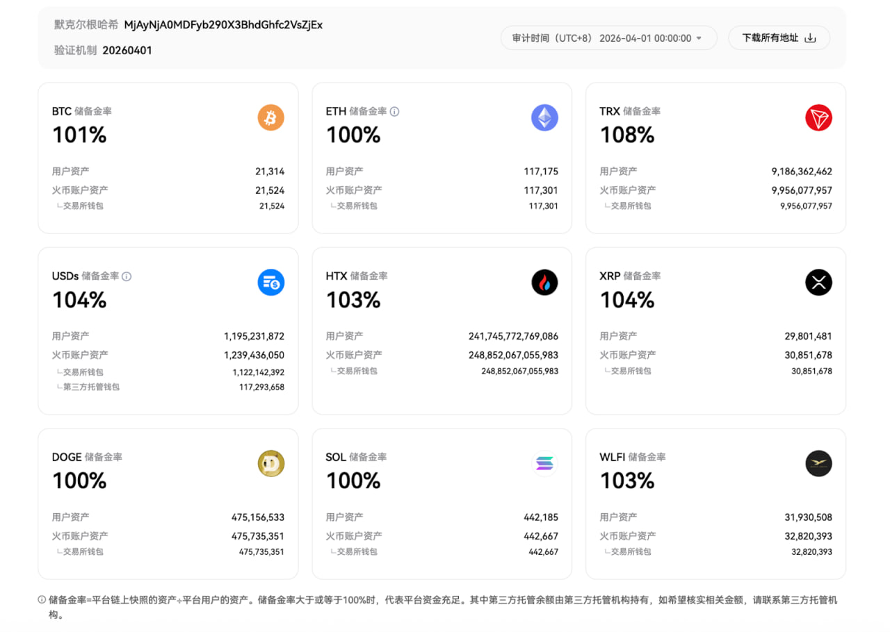 TechFlow 보도에 따르면, 4월 13일 화비 HTX가 공개한 최신 머클 트리 준비금 증명(PoR) 자료에 따르면, 2026년 4월 1일(UTC+8 기준)까지 플랫폼의 모든 자산 준비율이 지속적으로 100% 이상을 유지하고 있으며, 전반적인 자금 여유도가 충분하고 자산 투명성 및 안전성 역시 안정적이다. 이번 공개의 또 다른 주요 특징은 USDs의 추상적 집계 방식 업그레이드로, USDT, USDC 등 모든 달러 기반 스테이블코인을 ‘USDs’라는 단일 항목으로 통합하여 표시함으로써 자산 구조의 명확성과 가독성을 한층 높였다는 점이다.