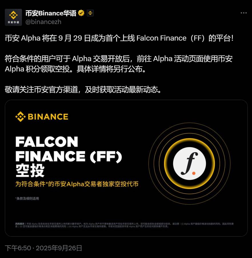 币安 Alpha 将在 9 月 29 日上线 Falcon Finance(FF),符合条件的用户可申领空投