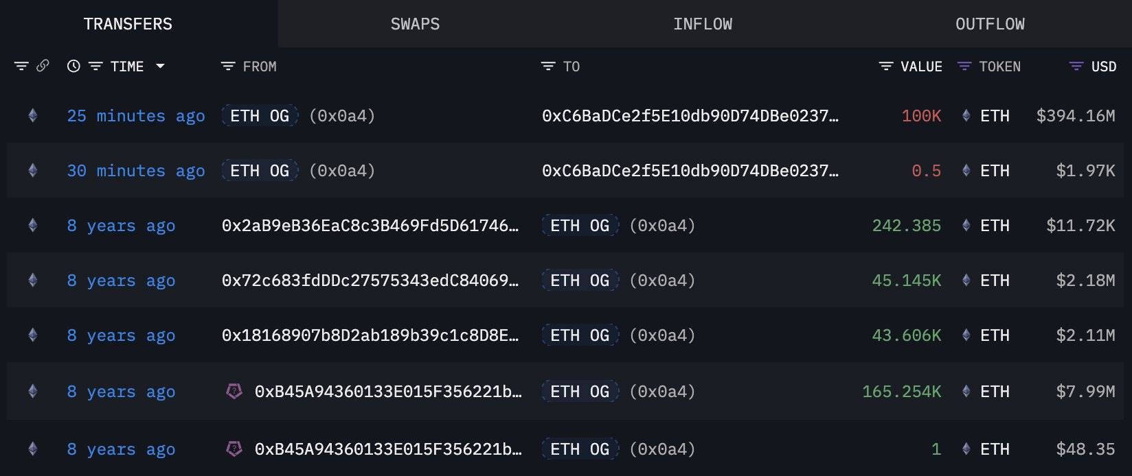 两个沉寂 8 年的钱包重新激活并转移 20 万枚 ETH,价值 7.85 亿美元