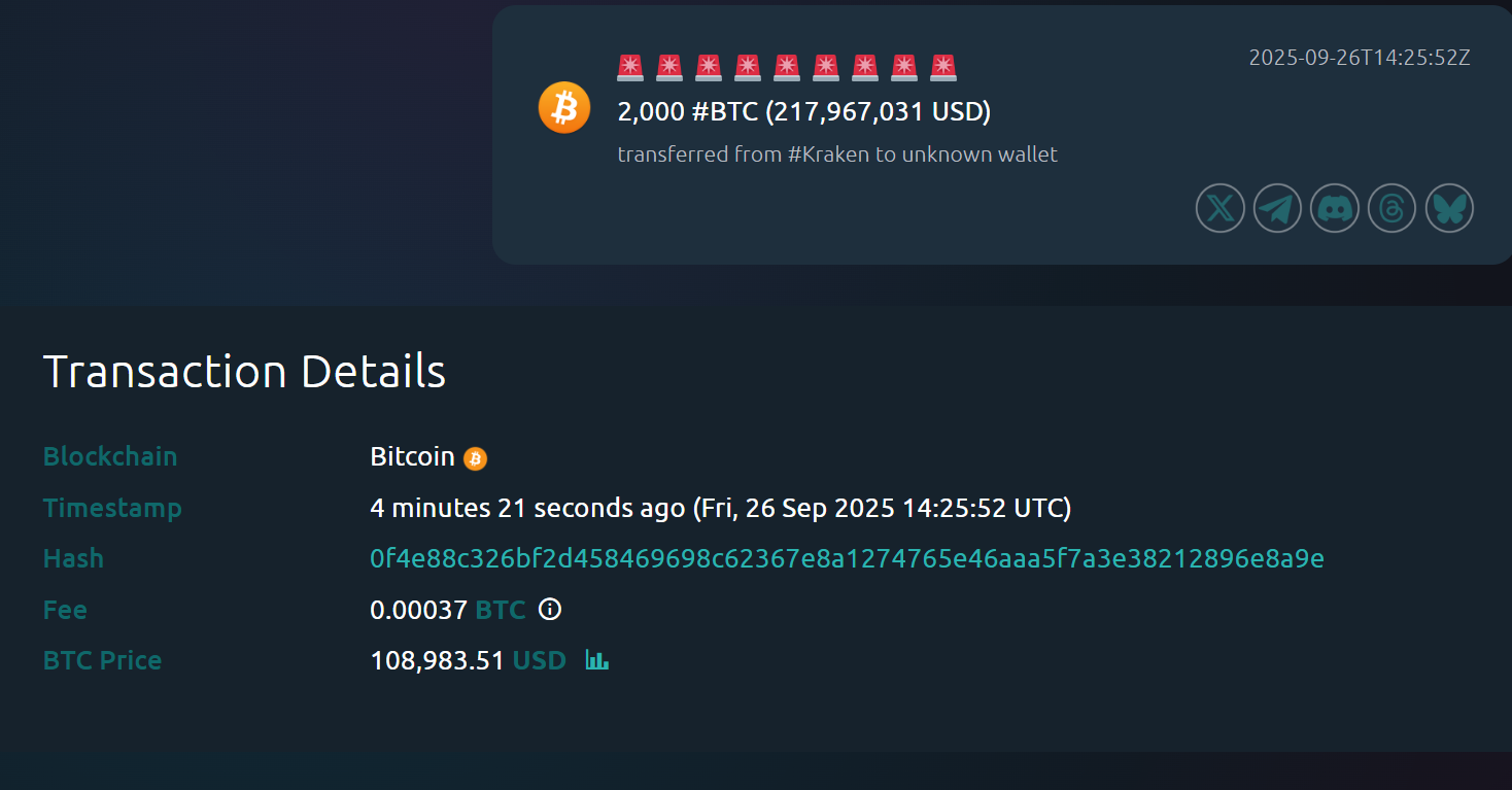 2,000 枚 BTC 从 Kraken 交易所转至某未知钱包地址,价值约 2.18 亿美元