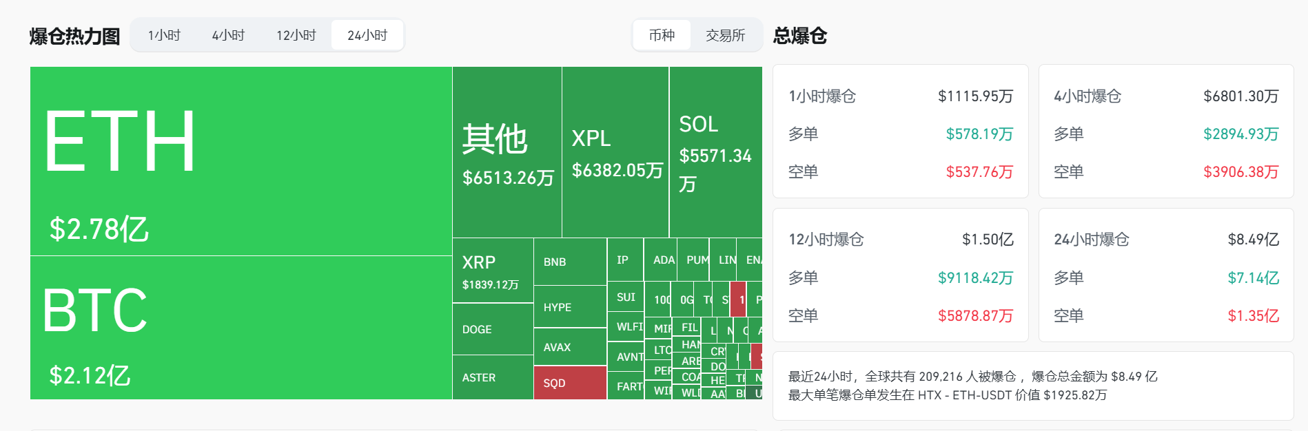 过去 24 小时全网爆仓 8.49 亿美元,主爆多单