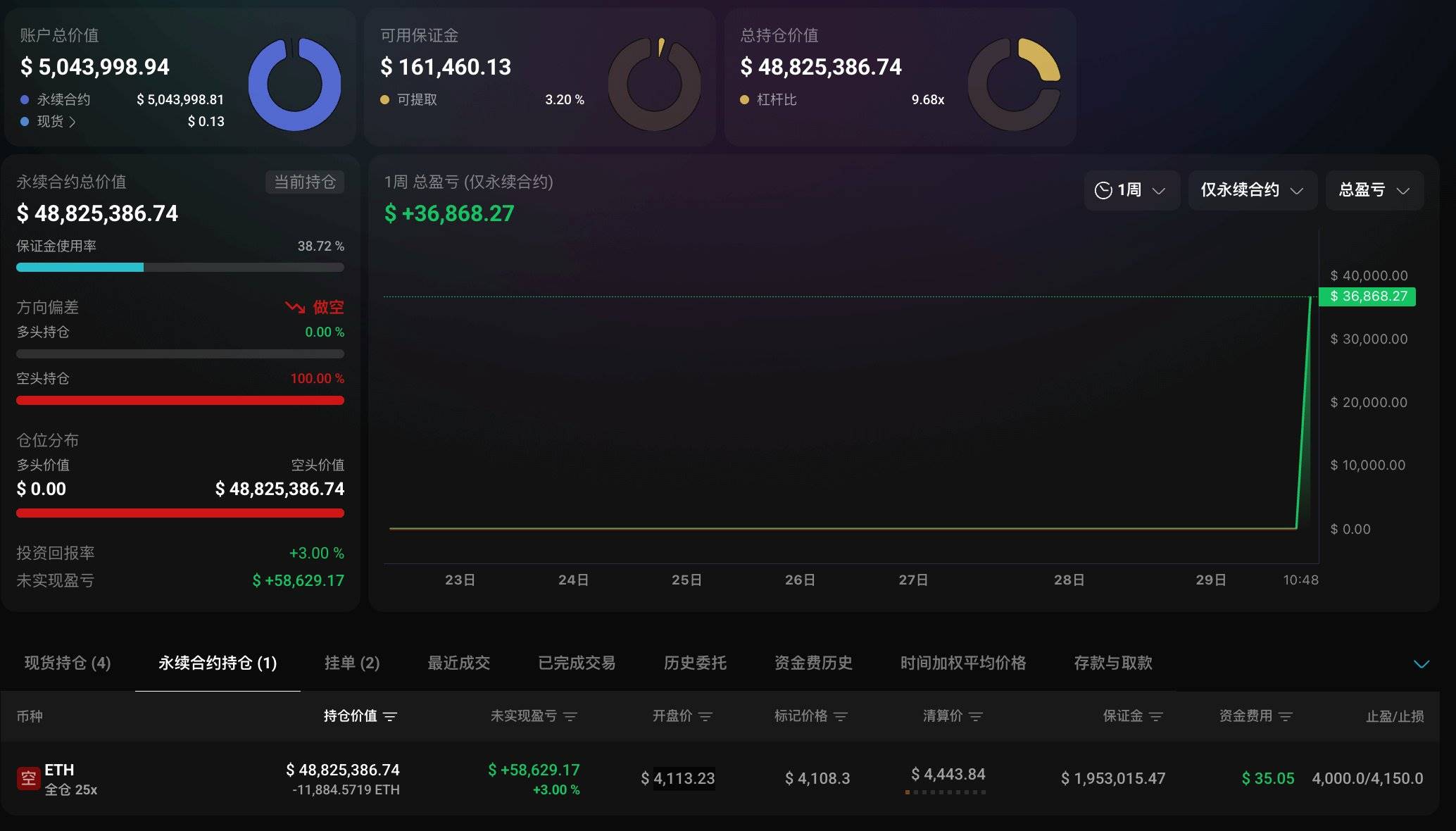 该地址一小时前向 Hyperliquid 充值 500 万枚 USDC 作为保证金,随后开启 11,884.57 ETH 的空单,开仓价格为 4,113.23 美元,目前浮盈 4.4 万美元。