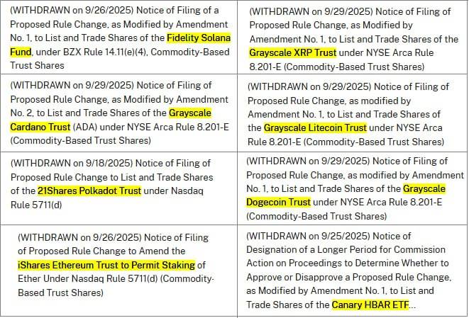 深潮 TechFlow 消息,9 月 30 日,美国证券交易委员会网站显示,按照通用上市标准,Solana、XRP、Cardano、Litecoin、Dogecoin、Polkadot、Hedera 以及 ETH Staking ETF 的 19b-4 申请已被撤回。