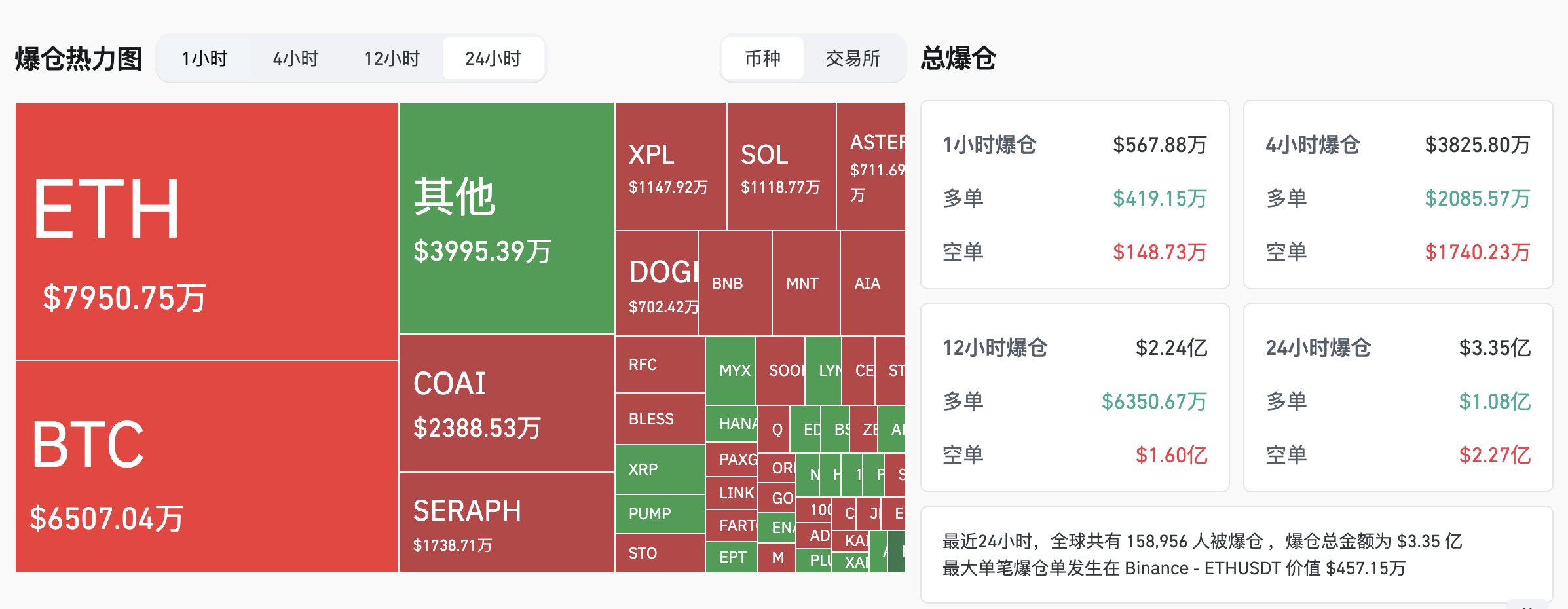 过去 24 小时全网爆仓 3.35 亿美元,空单爆仓 2.27 亿美元