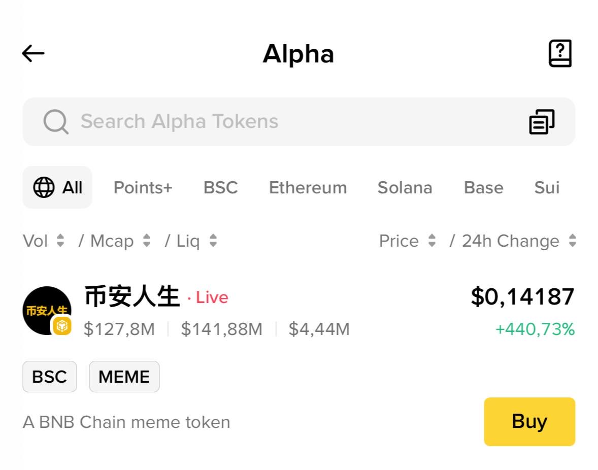 深潮 TechFlow 消息,10 月 7 日,据官方页面显示,Binance Alpha 上线 Meme 币「币安人生」。