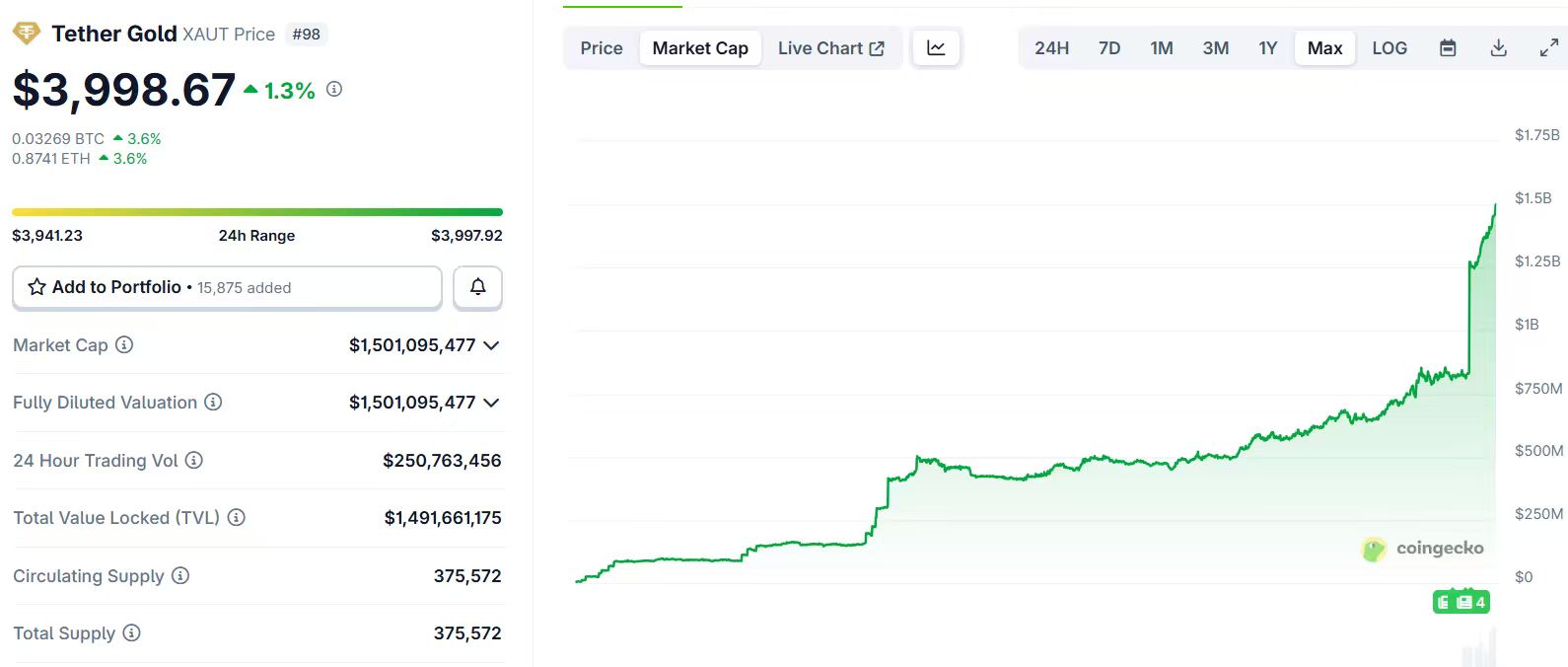 深潮 TechFlow 消息,10 月 7 日,据Coingecko最新数据显示,随着黄金价格走高,代币化黄金Tether Gold(XAUT)市值已突破15亿美元,现报1,501,095,477美元,创历史新高。