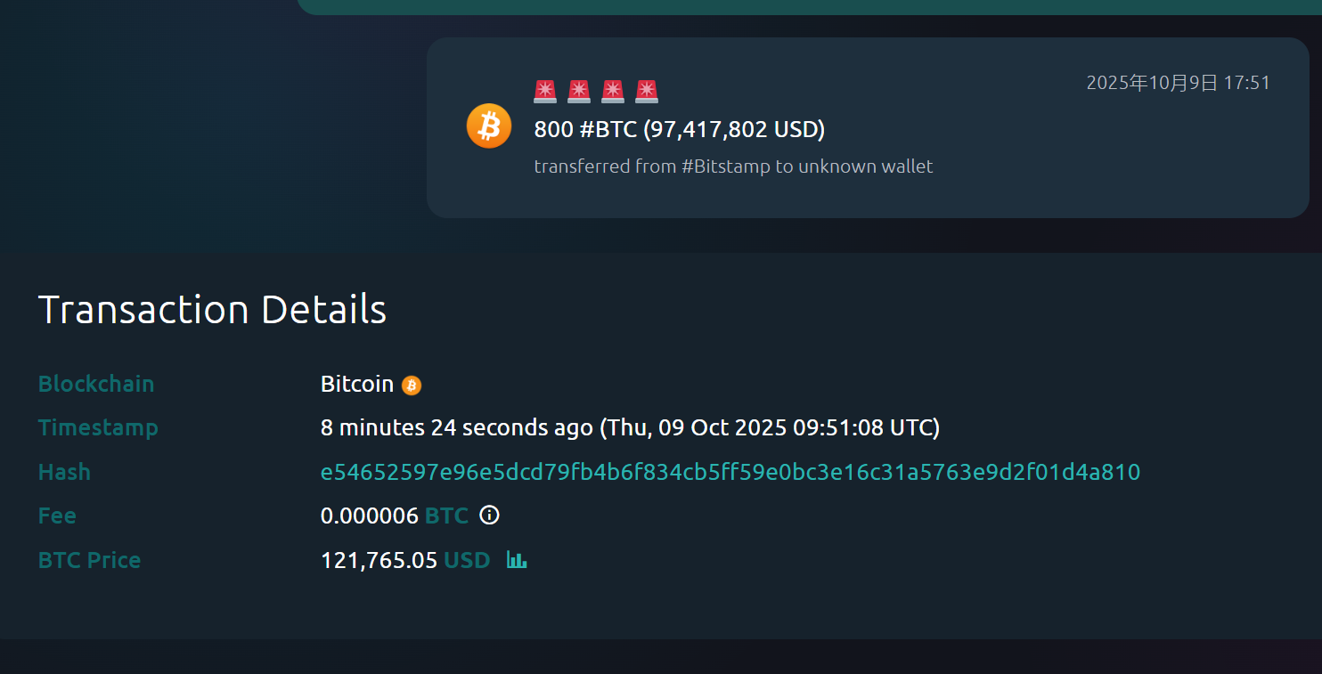 800 枚 BTC 从 Bitstamp 交易所转移至未知钱包 ,价值约 9741.78 万美元