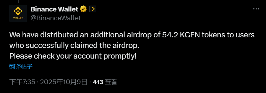 币安钱包:已对成功领取 KGEN 代币空投的用户追加 54.2 枚 KGEN 空投