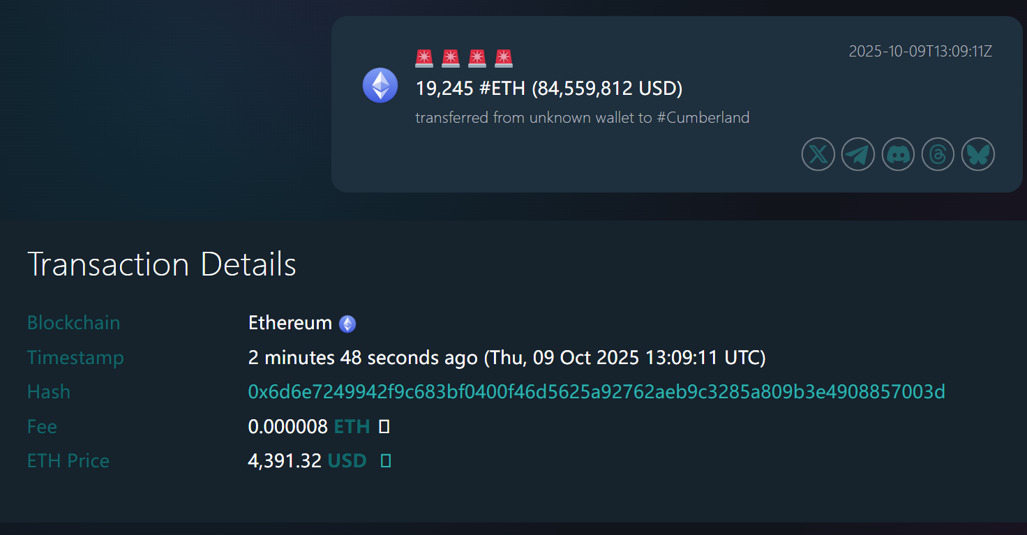 深潮 TechFlow 消息,10 月 9 日,据 Whale Alert 监测,约三分钟前 19,245 枚 ETH 从某未知钱包转入做市商 Cumberland 钱包,价值约 8456 万美元。