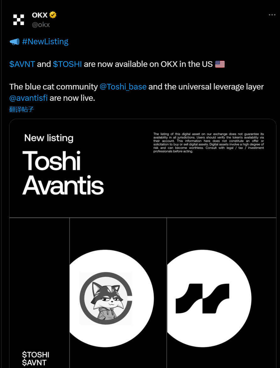 OKX 已在美国市场上线 AVNT 和 TOSHI