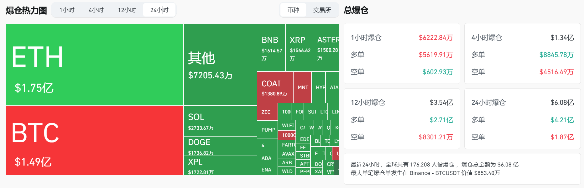 过去 24 小时全网爆仓 6.08 亿美元,主爆多单