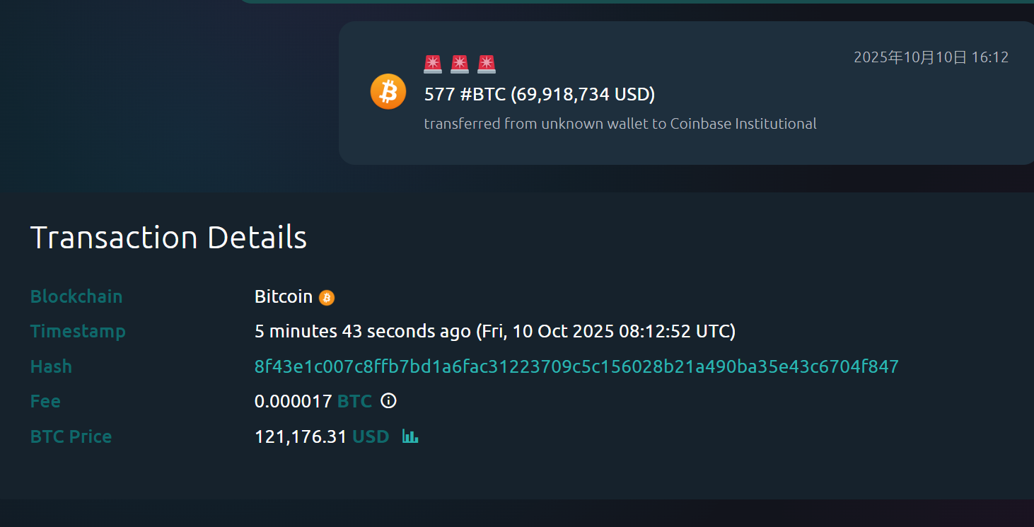 深潮 TechFlow 消息,10 月 10 日,据 Whale Alert 监测,某鲸鱼约 10 分钟前向 Coinbase Institutional 转入 577 枚 BTC,价值约 69,918,734 美元。