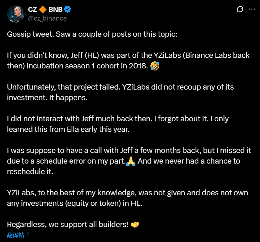 CZ 进一步澄清,据其了解,YZiLabs 并未获得也不持有 Hyperliquid 的任何投资(股权或代币)。此前 CZ 曾计划与 Jeff 通话,但因日程安排错误错过了会议,之后也未能重新安排。CZ 最后表示,无论如何都支持所有建设者。