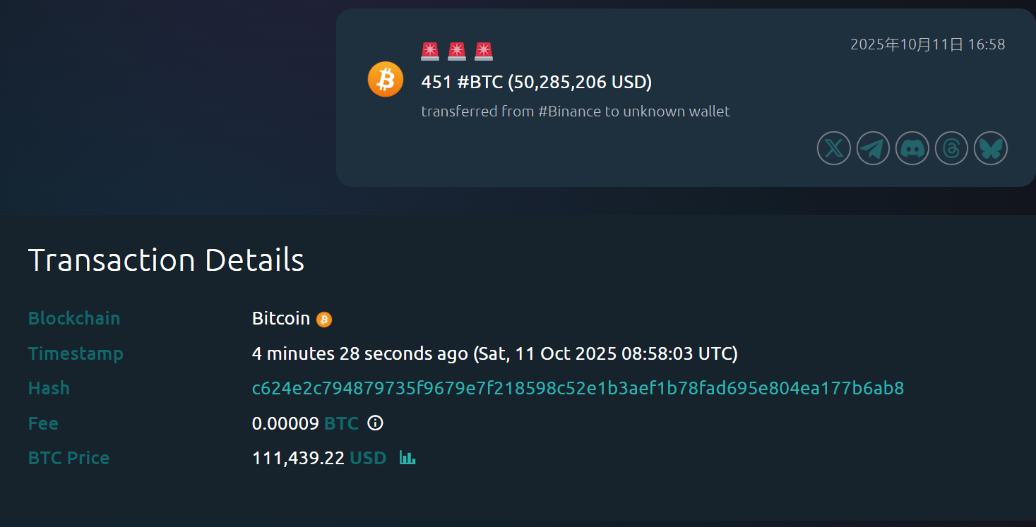 451 枚 BTC 约 5 分钟前从币安转出至某未知钱包,价值约 5028.5 万美元