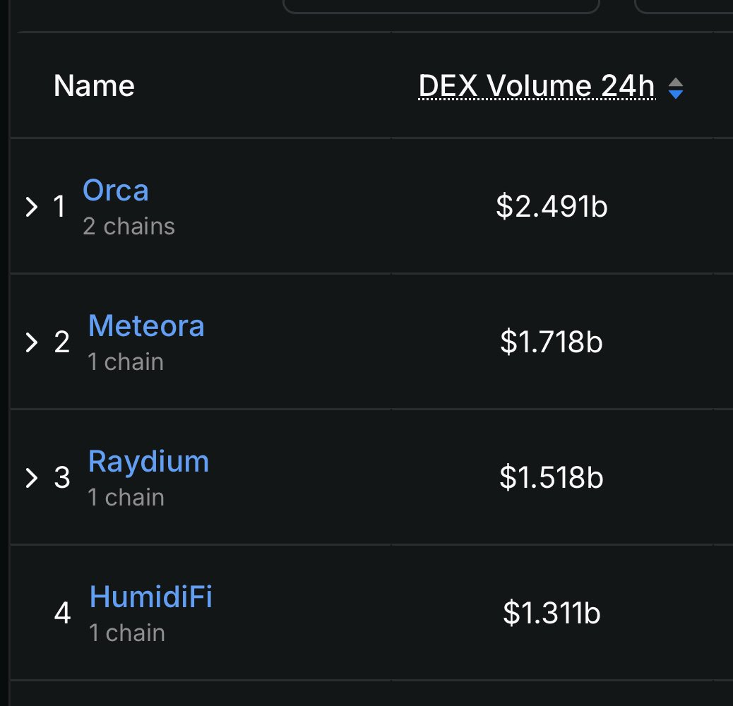 数据显示,Orca、Meteora、Raydium、HumidiFi 四个 Solana 去中心化交易所的 24 小时交易量均突破了 10 亿美元大关。
